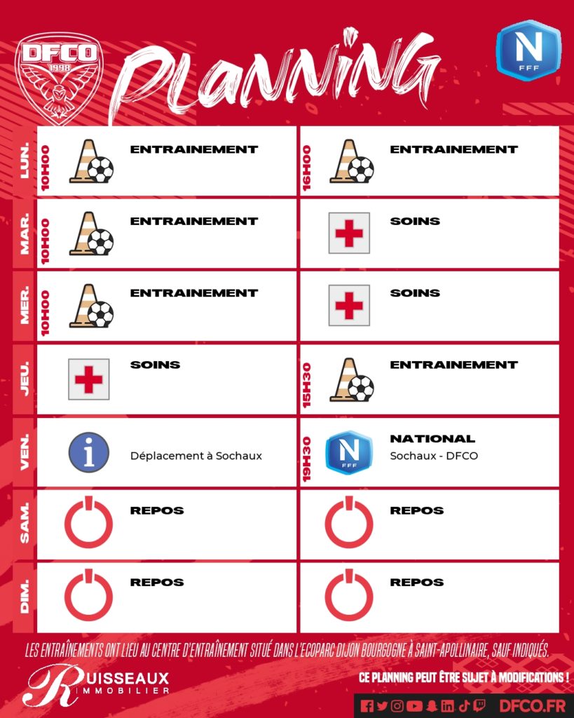 Cette semaine, le DFCO aura pour mission d’enchaîner une quatrième victoire consécutive sur la pelouse de Sochaux, vendredi au stade Bonal (19h30 / 32e journée de National). Voici le planning des entraînements collectifs !