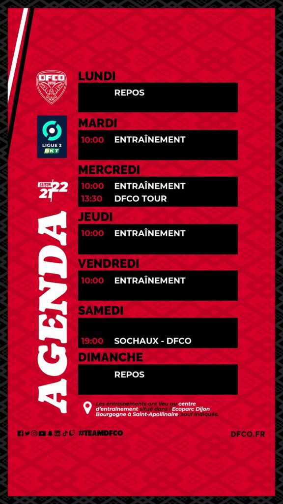 Dernière semaine de travail pour le groupe professionnel avant un dernier match à Sochaux samedi (19h00). Mercredi après-midi, joueurs du groupe L2 et joueuses de D1 participeront au DFCO TOUR by Crédit Mutuel (+ d’infos en cliquant ici).