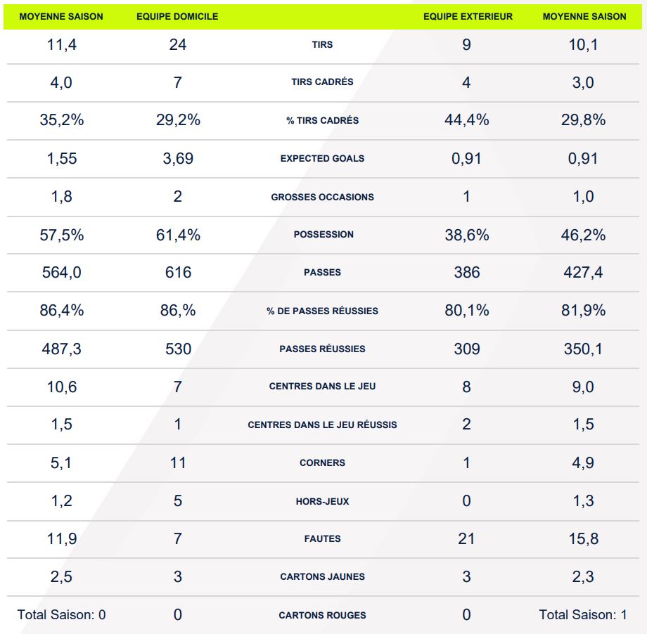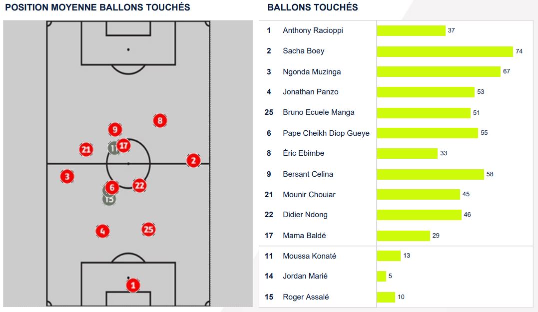 - Le DFCO a affiché un de ses plus faibles pourcentage de possession cette saison (38,6 % contre 46,2 % de moyenne). C'est notamment en seconde période que les Aiglons ont davantage monopolisé le ballon.
