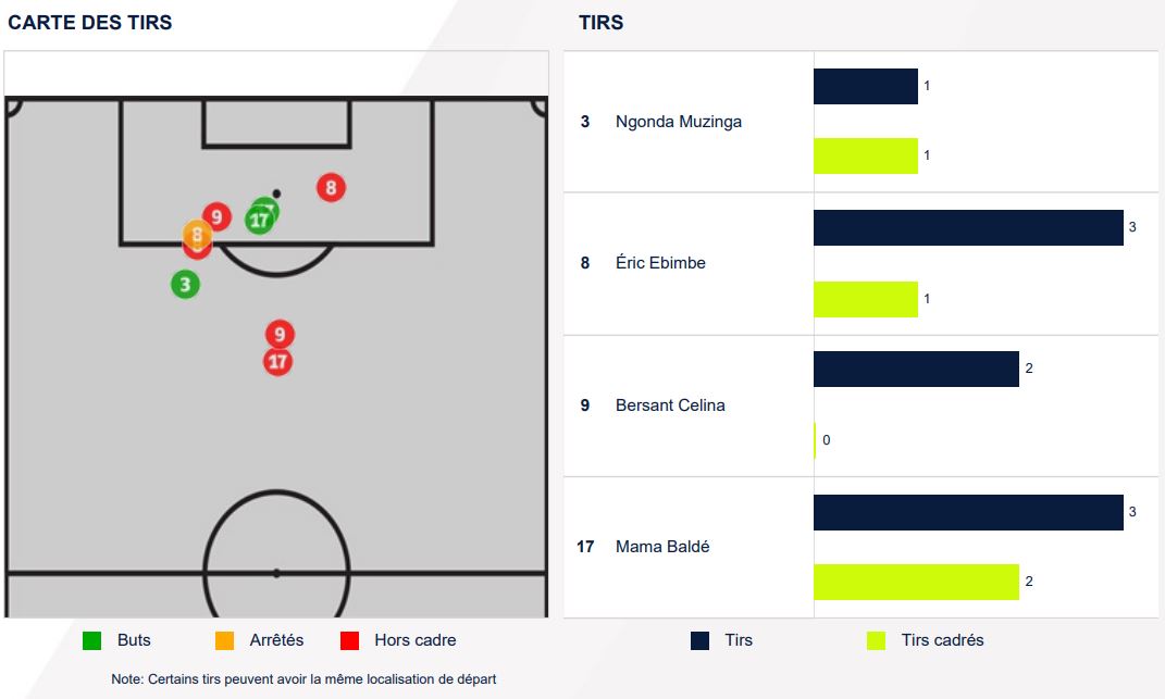 - Mama Baldé a tenté sa chance à trois reprises, trouvant le chemin des filets à deux reprises. Junior Dina Ebimbe a également frappé trois fois.