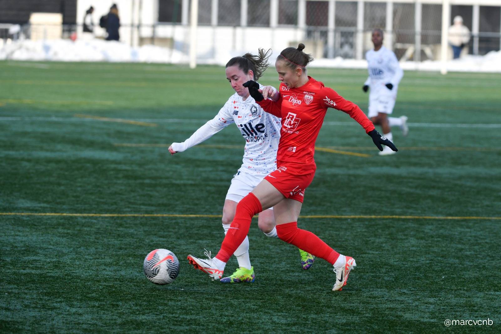Lisa Lichtfus et sa défense sont bien en place. La gardienne dijonnaise est vigilante sur un coup franc de Julie Pian (27’), avant que les joueuses offensives ne fassent à nouveau parler la poudre. Servie au second poteau, Meriame Terchoun ne parvient pas à trouver un angle de frappe, elle repique pour finalement trouver Malou Marcetto qui arrive lancée. La Danoise s’excentre avant de se retourner et de frapper dans un angle complètement fermé. Elisa Launay est battue. Les Rouges font le break ! (0-2, 34’)