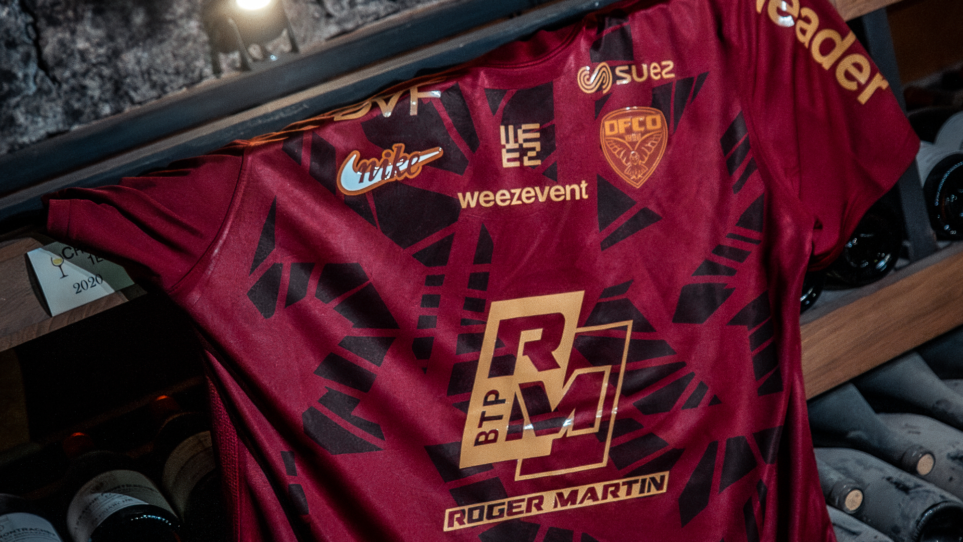 De couleur grenat avec les partenaires du DFCO sublimés, ce maillot représente de manière abstraite, les Climats de Bourgogne, vus du haut.