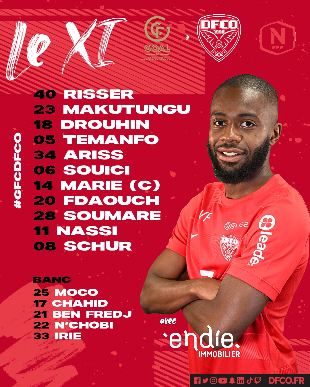 Le 11 de départ du DFCO : Risser – Makutungu, Drouhin, Temanfo, Ariss – Marié (Cap), Souici – Fdaouch, Soumaré, Nassi – Schur