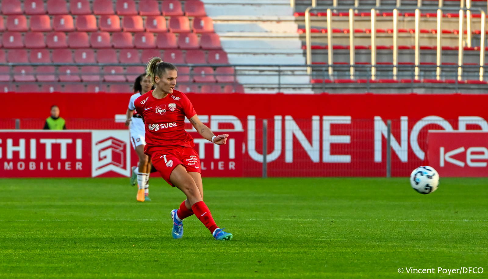 Dans ce premier match à domicile, nos Dijonnaises sont cueillies à froid. Meffometou ouvre la marque d’une lourde frappe des 18 mètres parfaitement placée. Katriina Talaslahti n’y peut rien (0-1, 4’)