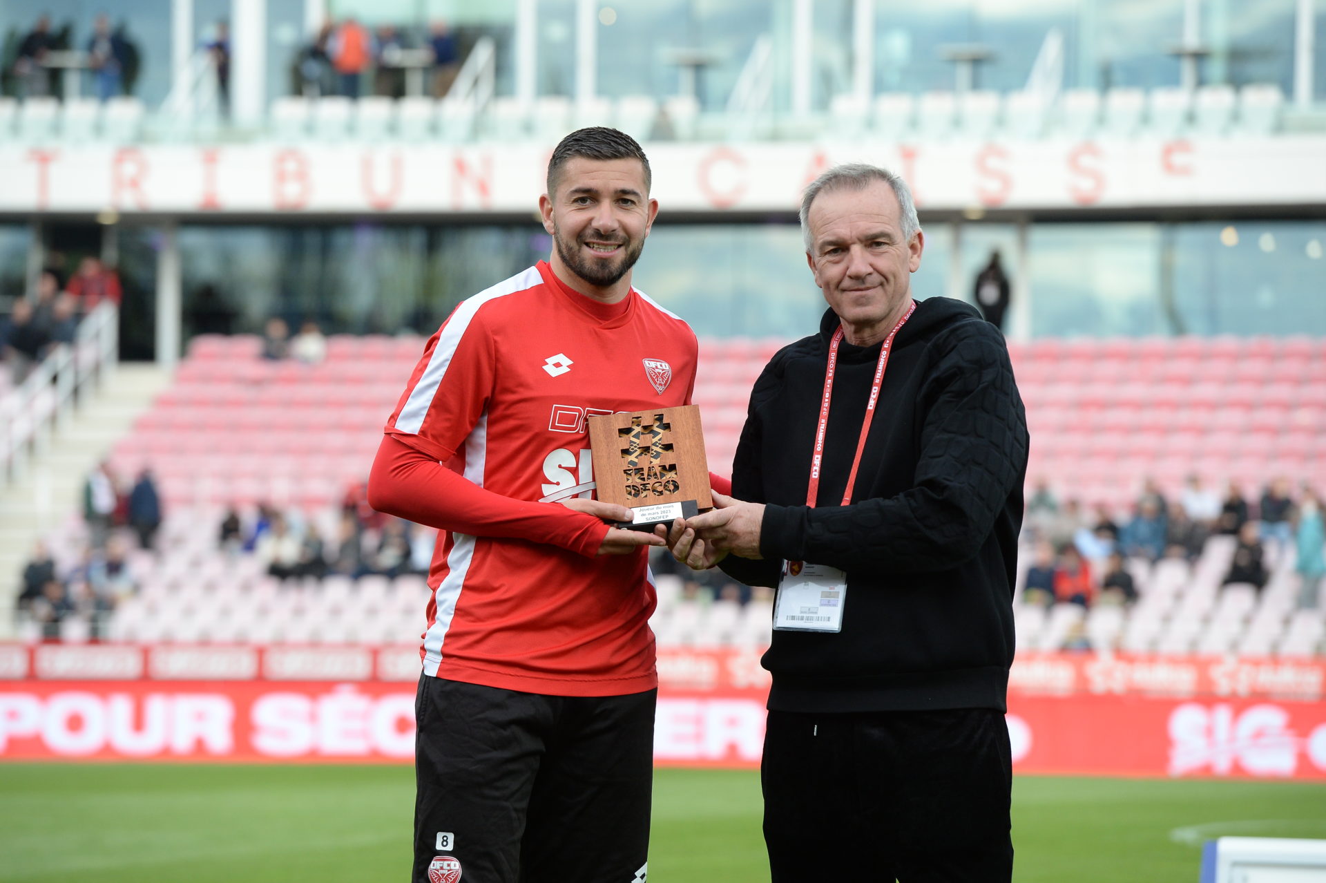 Le trophée lui a été remis par Claude Seguin, Directeur de la jardinerie Sonofep, lors de l’avant-match de la rencontre DFCO-Rodez.