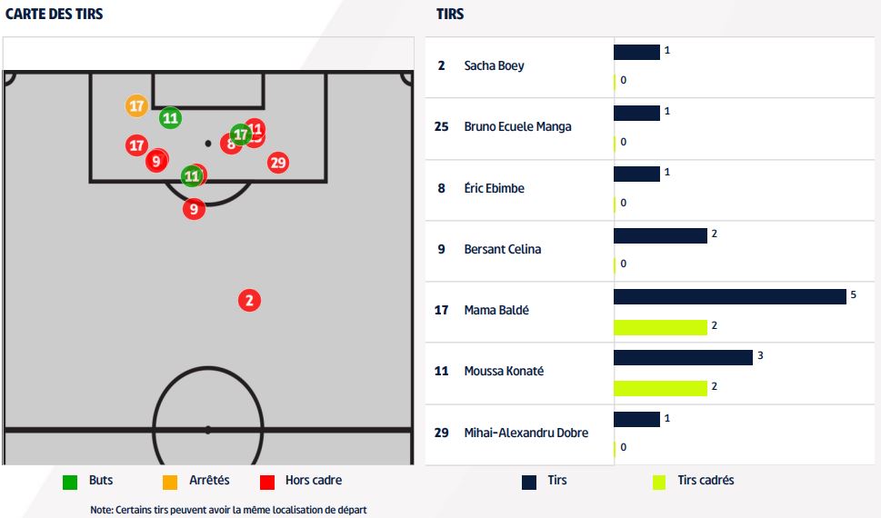 - Mama Baldé a tenté sa chance à 5 reprises devant le but et cadré 2 fois. Moussa Konaté a lui marqué 2 buts sur ses 2 frappes cadrées !