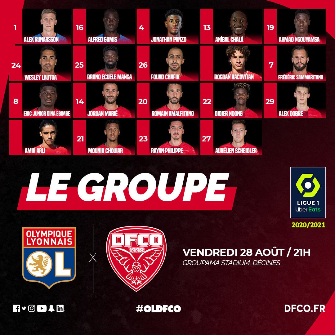 Pour le compte de la 2e journée de Ligue 1 Uber Eats, le DFCO se déplace ce vendredi (21h00) au Groupama Stadium pour défier l'Olympique Lyonnais. Stéphane Jobard et son staff ont convoqué un groupe de 19 joueurs.