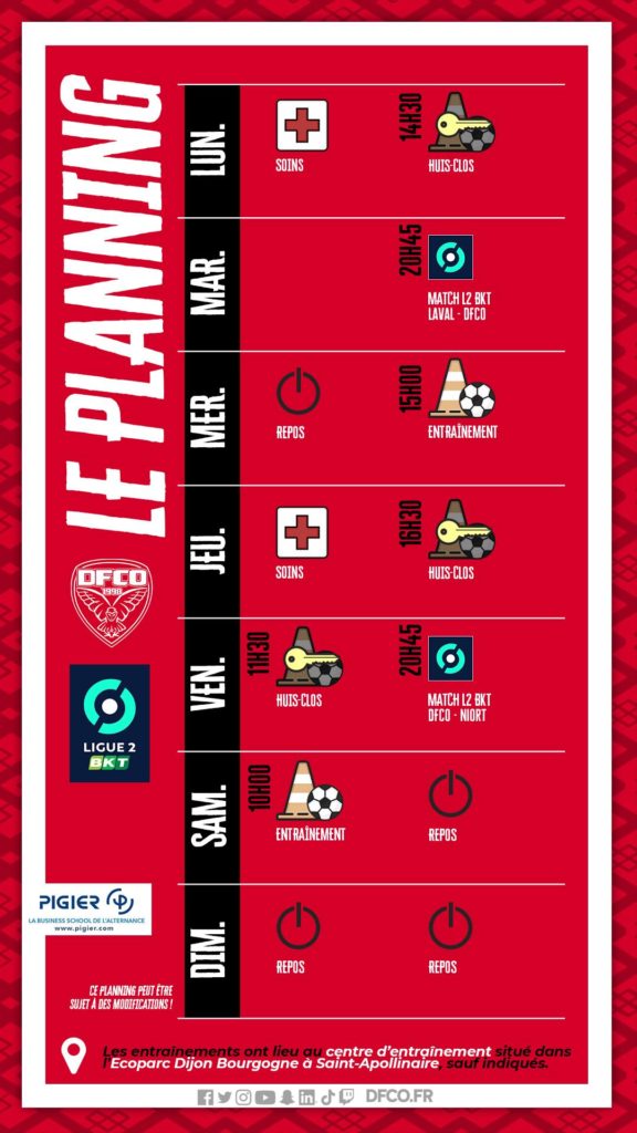 Cette semaine, le DFCO va enchaîner deux matchs importants en l’espace de 4 jours ! Le premier ce mardi à Laval et le second contre Niort vendredi au stade Gaston-Gérard. Voici le planning de la semaine.