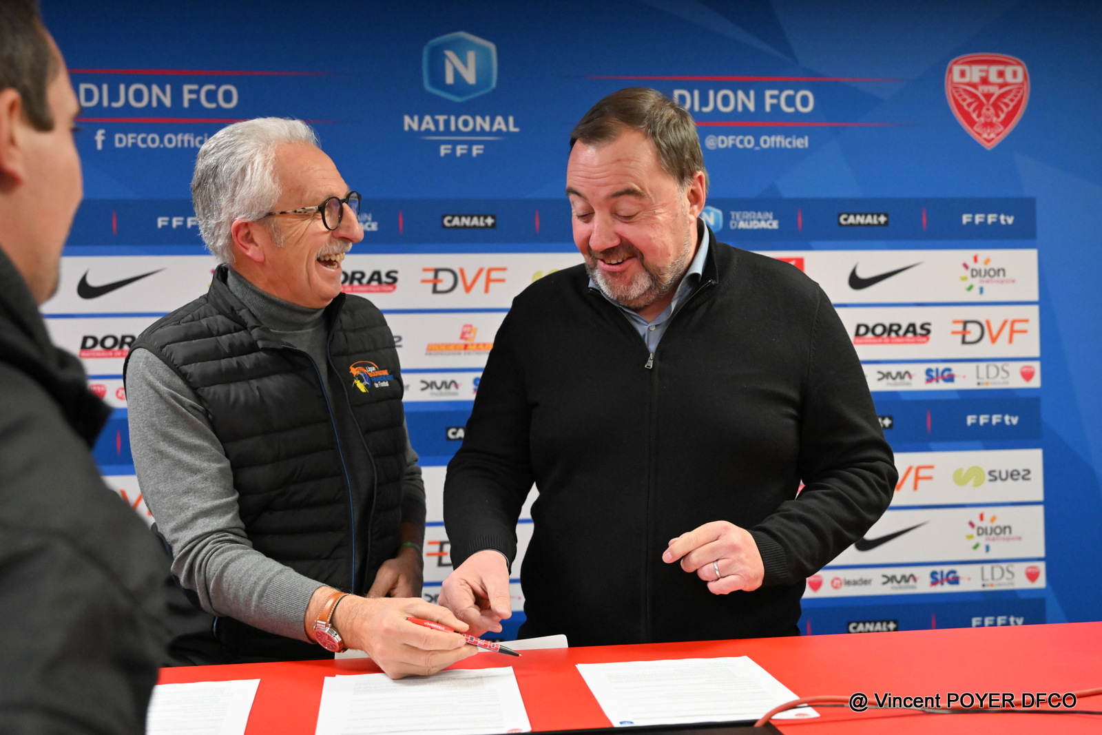 Vendredi soir, dans le cadre du match DFCO – Red Star, a eu lieu une signature de conventions avec la Ligue de Bourgogne Franche-Comté, ainsi que les districts de Côte d’Or et du Jura.