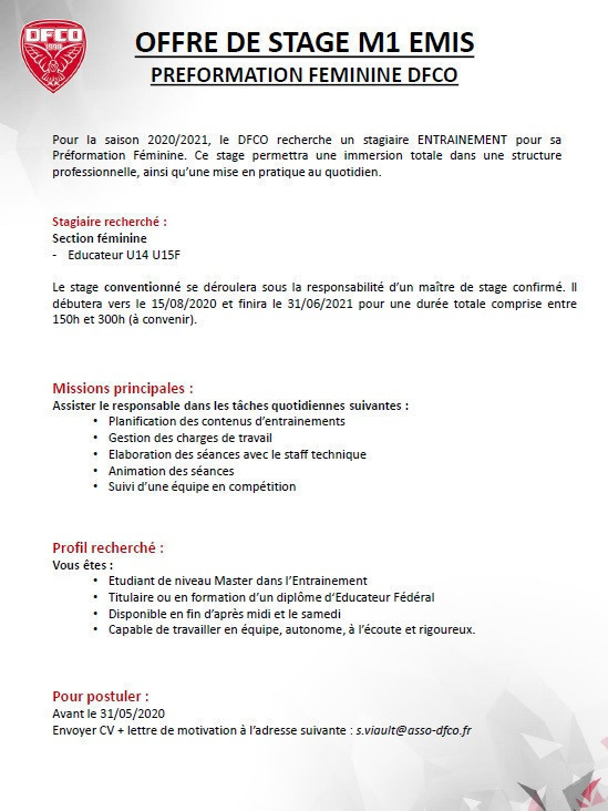 En prévision de la nouvelle saison, le DFCO recherche un stagiaire entrainement pour sa préformation féminine. Toutes les informations ci-dessous.