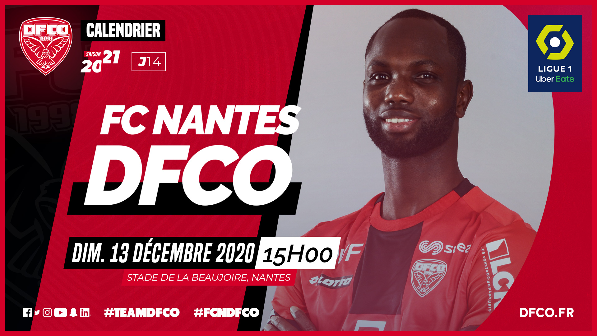 La LFP a annoncé la programmation de la 14e journée de Ligue 1 Uber Eats. Le DFCO se déplacera à Nantes le dimanche 13 décembre à 15h00.