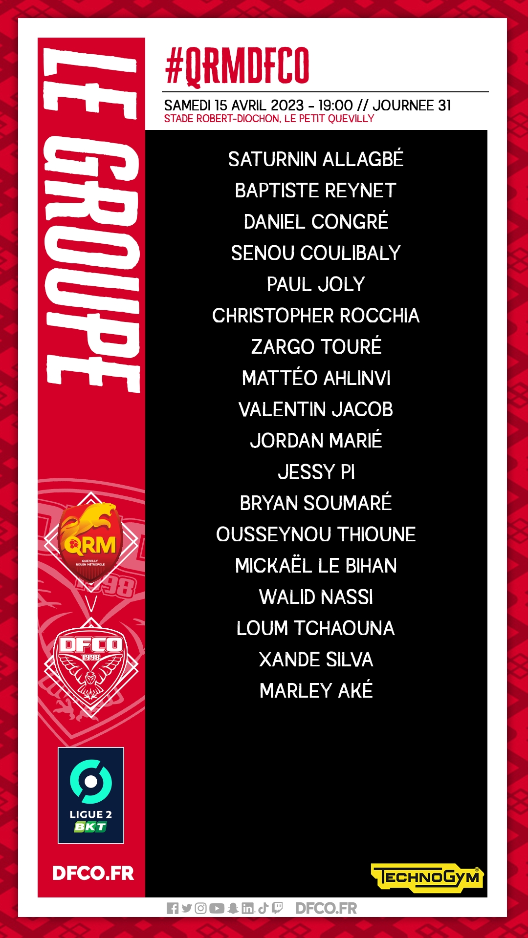 Pour le match Quevilly Rouen Métropole – DFCO (31e journée de Ligue 2 BKT), Pascal Dupraz et son staff ont fait appel à un groupe de 18 joueurs.