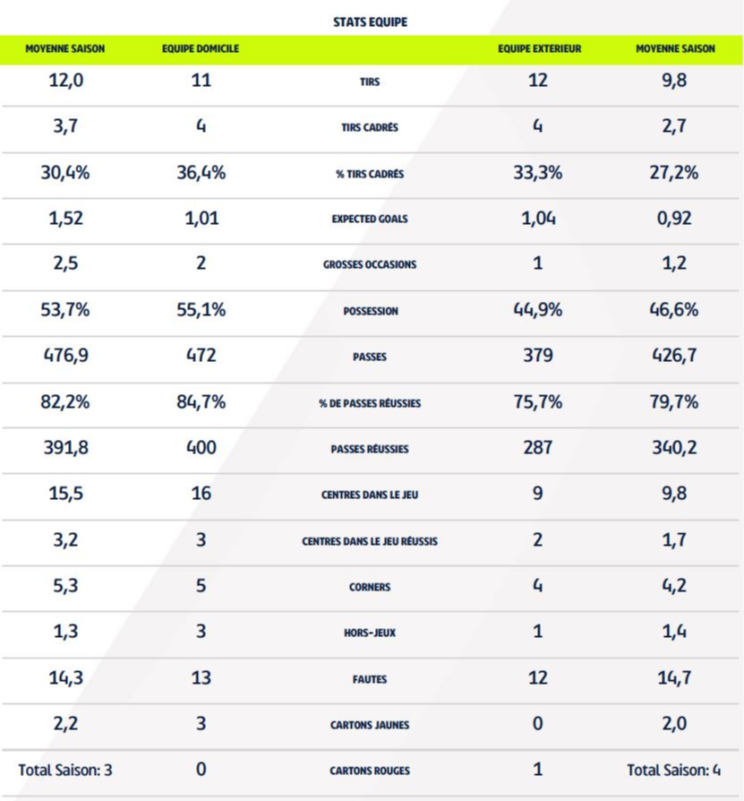 - Les deux formations ont quasiment fr,appé autant de fois et cadré 4 frappes chacune. Au niveau du taux de réussite des passes, Lens aura été plus précis avec 84,7 % de passes réussies, contre 75,7 % pour le DFCO.