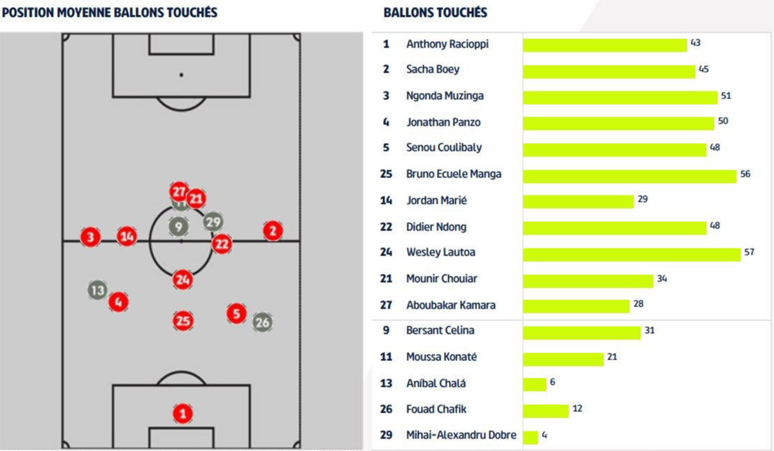 - Loïc Badé (93), Jonathan Gradit (82) et Cheick Doucouré (73) forment le trio des joueurs ayant touché le plus de ballons pendant ce RC Lens - DFCO. Côté dijonnais, ce sont Wesley Lautoa (57), Bruno Ecuele Manga (56) et Glody Ngonda (51).