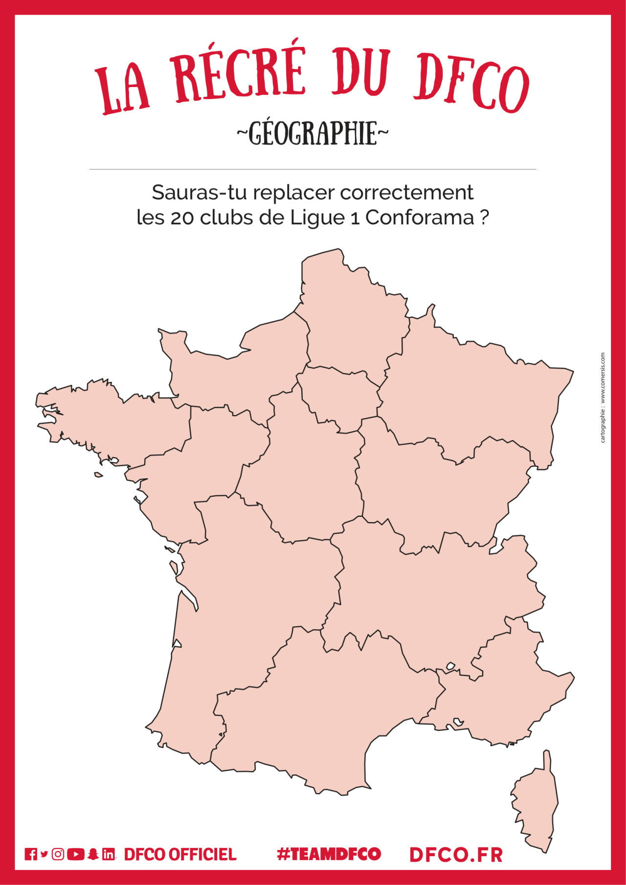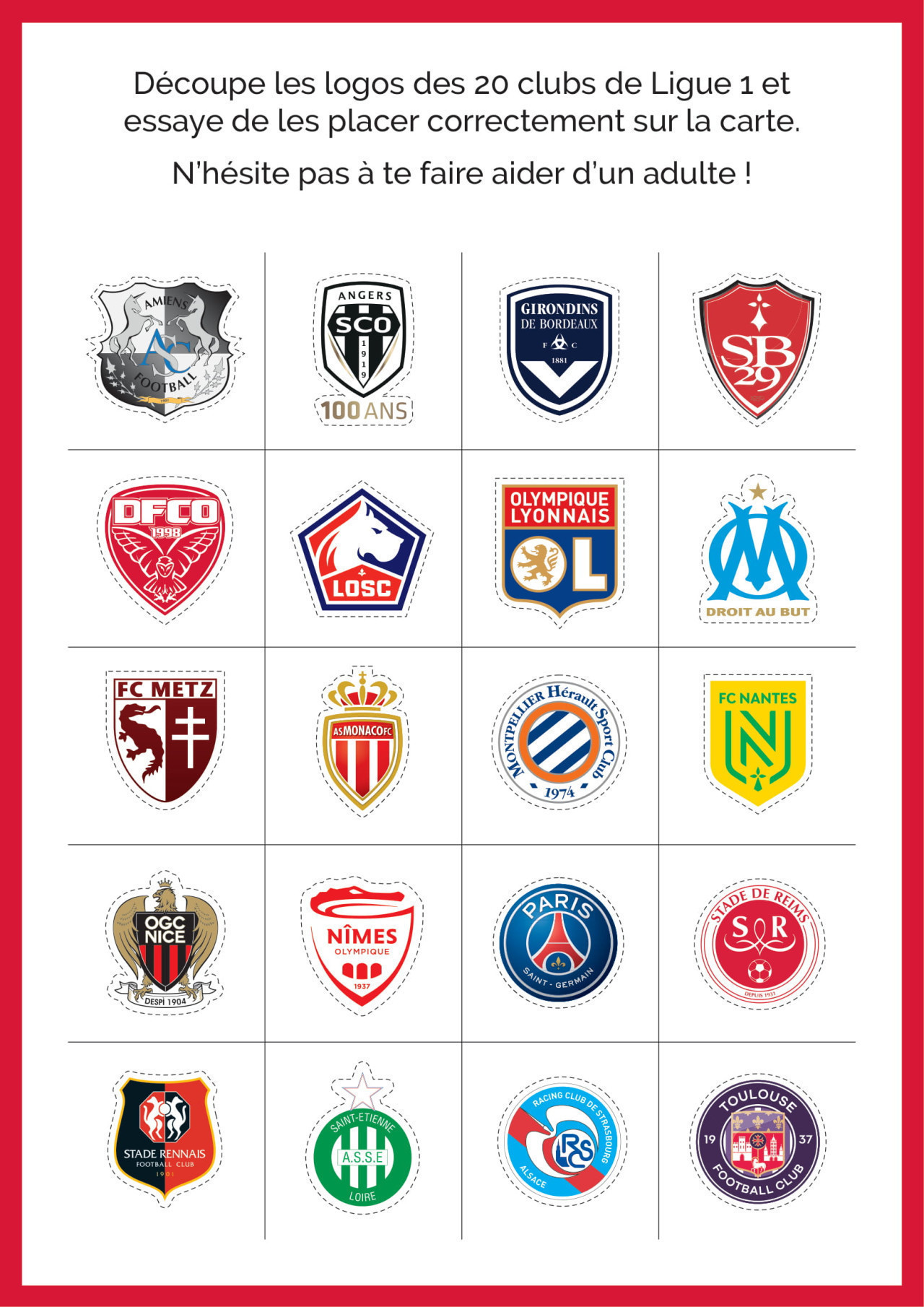 Après un concours de dessin, toujours en cours (voir en cliquant ici), la #RécréduDFCO vous propose une activité géographie en mode Ligue 1 Conforama ! Les enfants, avec l"aide ou non de vos parents, découpez et placez correctement chaque logo des 20 clubs de Ligue 1 sur la carte.