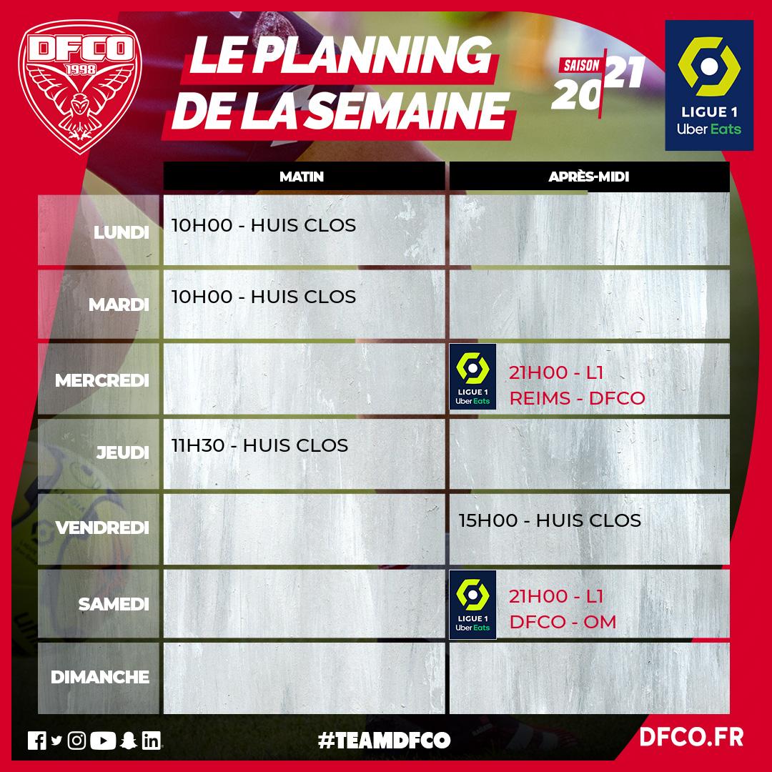 L"année 2021 débute fort pour le DFCO avec deux rendez-vous importants en championnat : un déplacement à Reims le mercredi 6 janvier (coup d"envoi à 21h00) et la réception de l"Olympique de Marseille le samedi 9 janvier (21h00). La totalité des matchs de la phase aller sera alors jouée.
