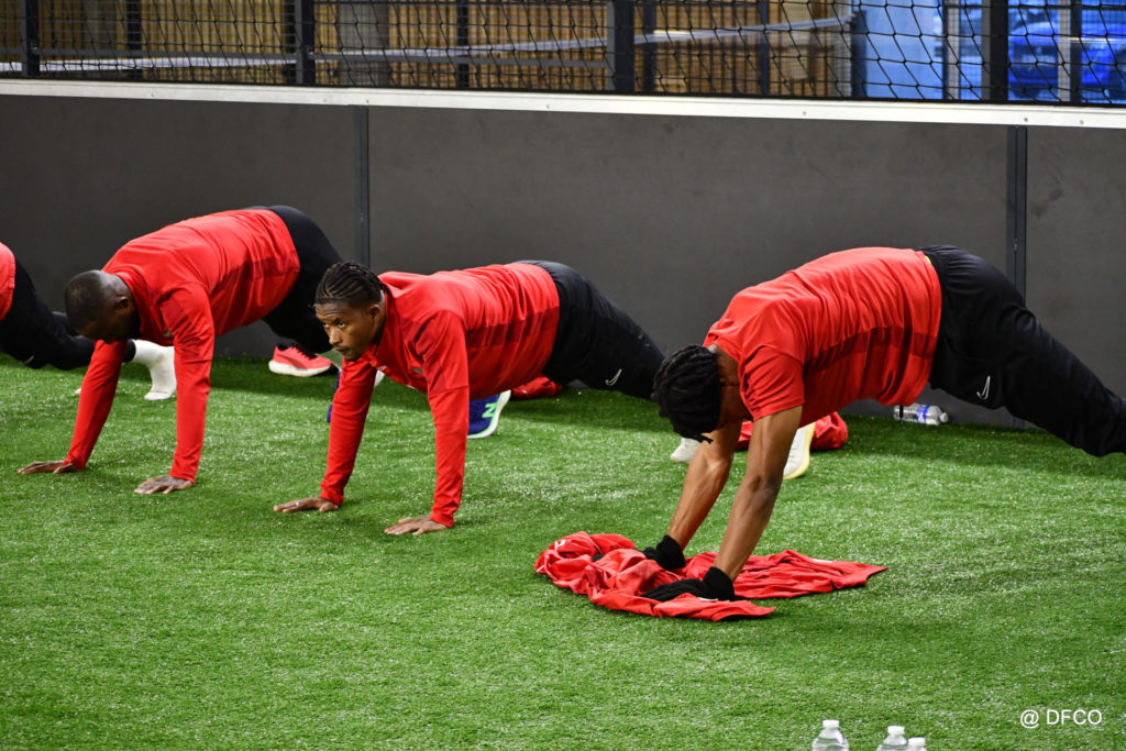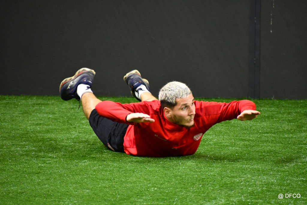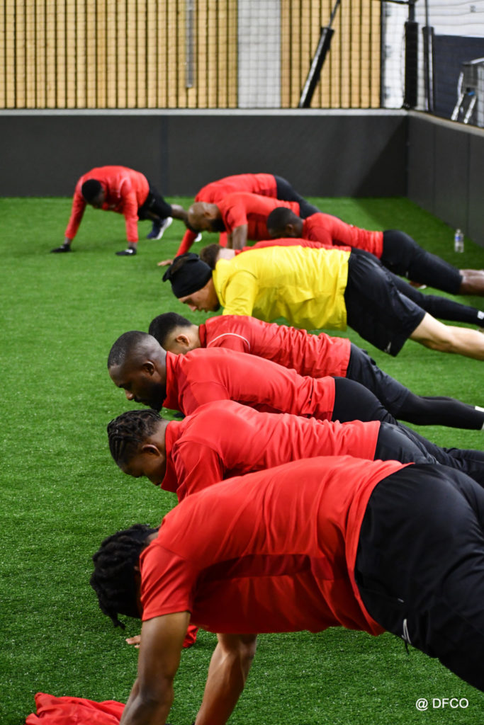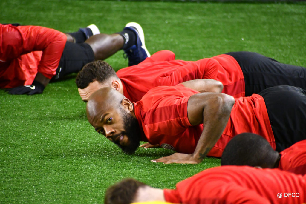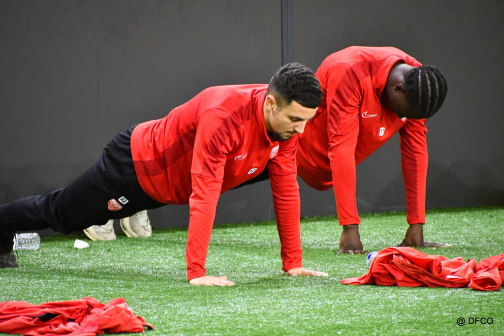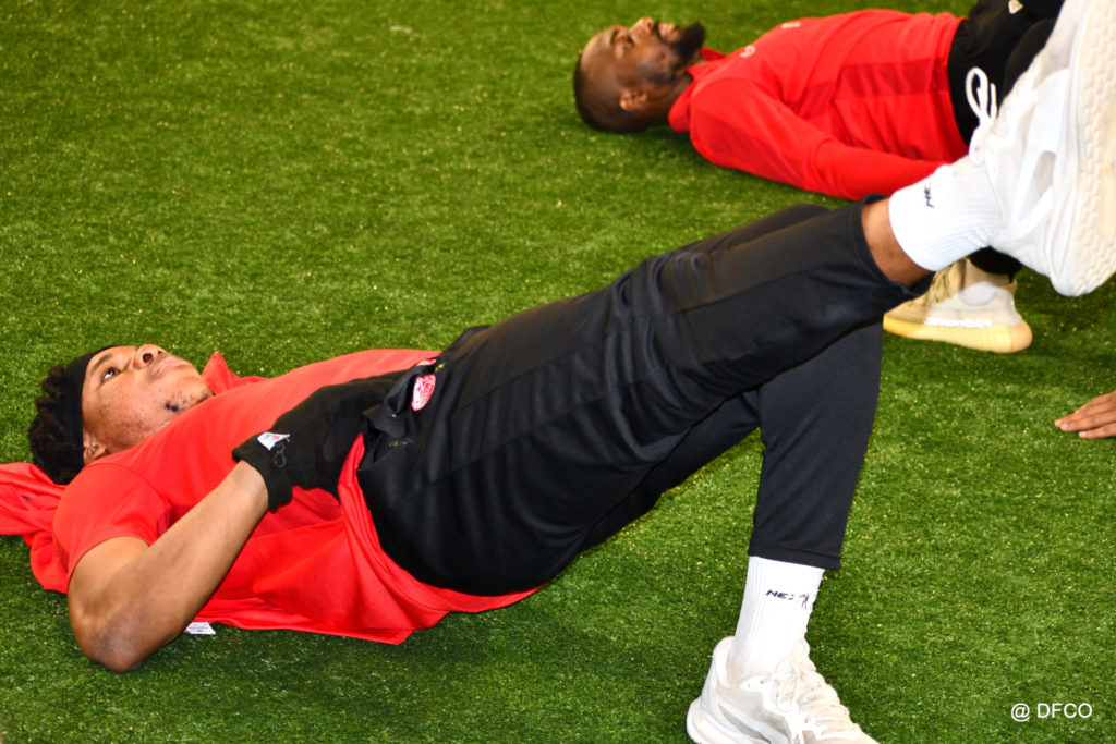 Alors que Joseph Mendes et Jordan Marié – de retour d’une longue période de blessure – étaient déjà en train de parfaire leur réathlétisation, l’ensemble de l’effectif avait rendez-vous à 15h00 pour la reprise des entraînements. Les sourires sur les visages traduisaient de vacances ressourçantes et d’un plaisir de se retrouver. Après quelques anecdotes sur les vacances, chaque joueur s’est rapidement remis au travail. En douceur pour commencer, en salle de musculation, puis de manière plus intensive au cours d’un footing de 6 kilomètres puis d’une séance de renforcement musculaire, en intérieur.