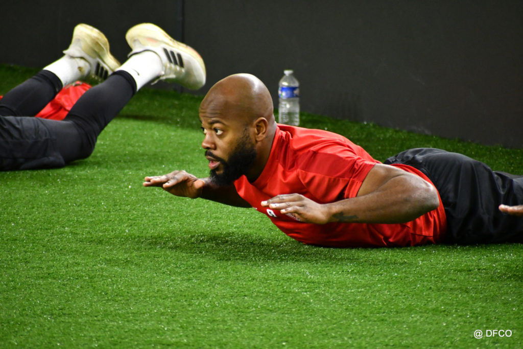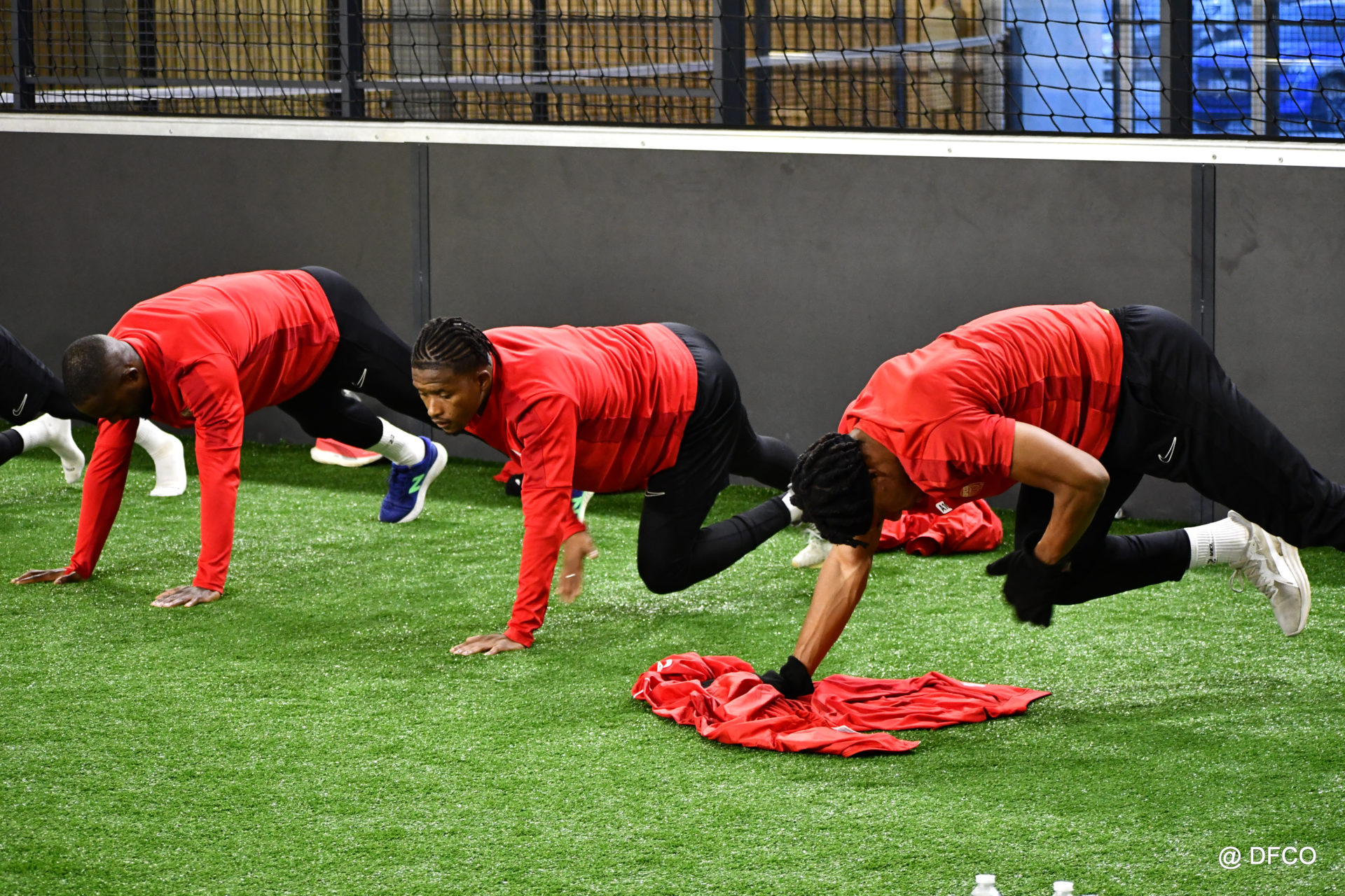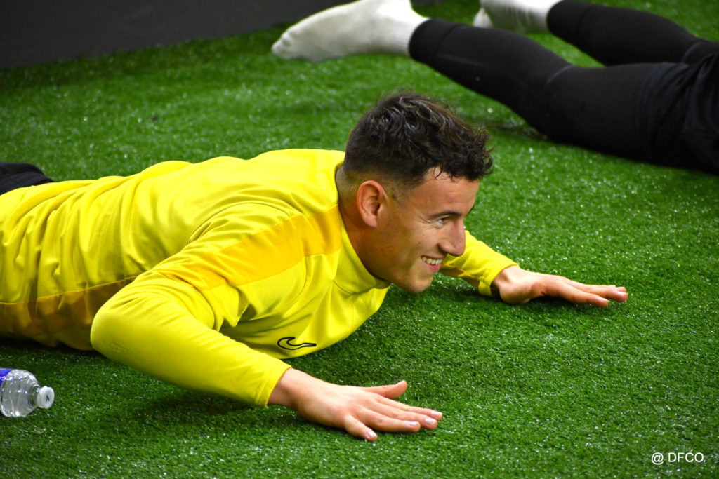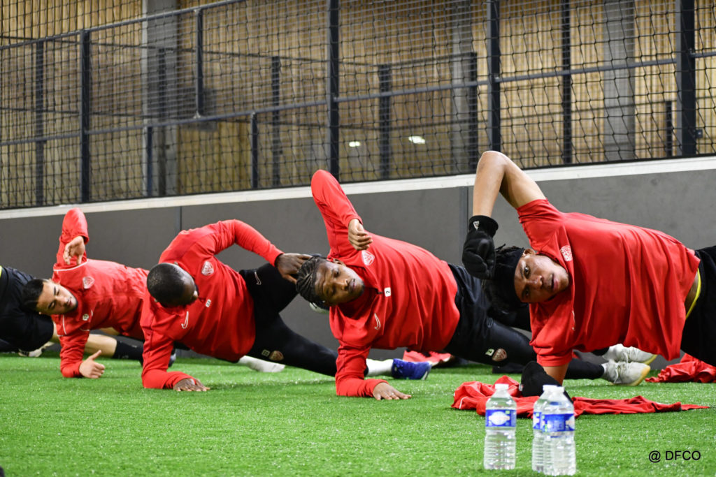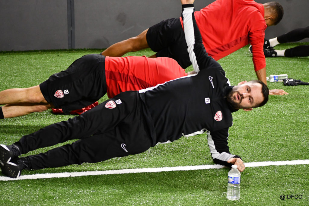 Alors que Joseph Mendes et Jordan Marié – de retour d’une longue période de blessure – étaient déjà en train de parfaire leur réathlétisation, l’ensemble de l’effectif avait rendez-vous à 15h00 pour la reprise des entraînements. Les sourires sur les visages traduisaient de vacances ressourçantes et d’un plaisir de se retrouver. Après quelques anecdotes sur les vacances, chaque joueur s’est rapidement remis au travail. En douceur pour commencer, en salle de musculation, puis de manière plus intensive au cours d’un footing de 6 kilomètres puis d’une séance de renforcement musculaire, en intérieur.