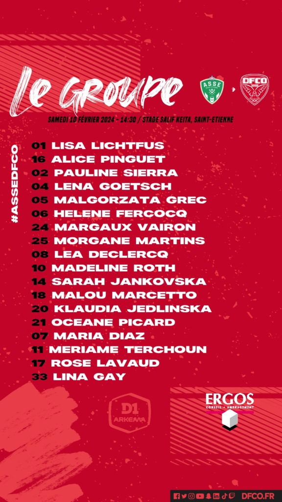 Pour le compte de la quinzième journée de D1 Arkema, le DFCO se déplace à Saint-Etienne ce samedi à 14h30. Voici le groupe concocté par Sébastien Joseph et son staff.