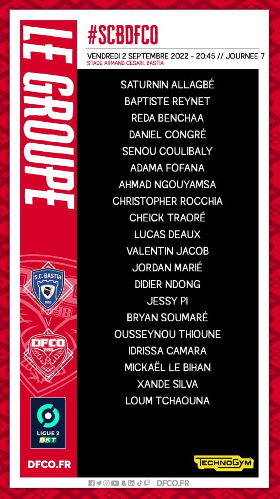 Zargo Touré, Walid Nassi et Roger Assalé sont indisponibles pour cause de blessure. Reda Benchaa et Lucas Deaux intègrent le groupe, tout comme la dernière recrue dijonnaise, Loum Tchaouna, qualifié pour cette rencontre.