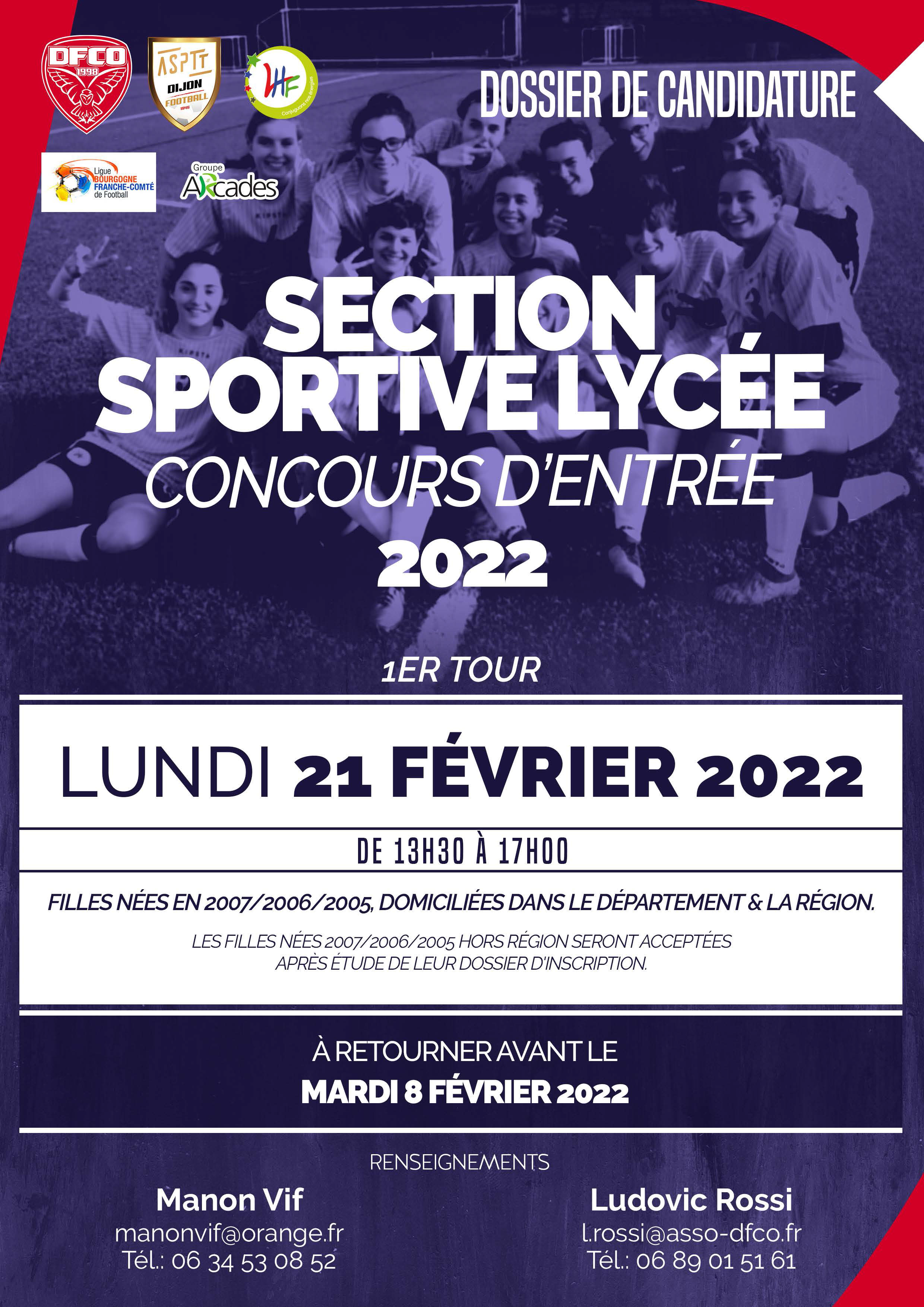 Pour vous inscrire, merci de retourner le dossier de candidature dûment rempli, avant le mardi 8 février 2022, à Manon Vif et Ludovic Rossi, Responsables Section Football Féminine Lycée : manonvif@orange.fr et l.rossi@asso-dfco.fr .