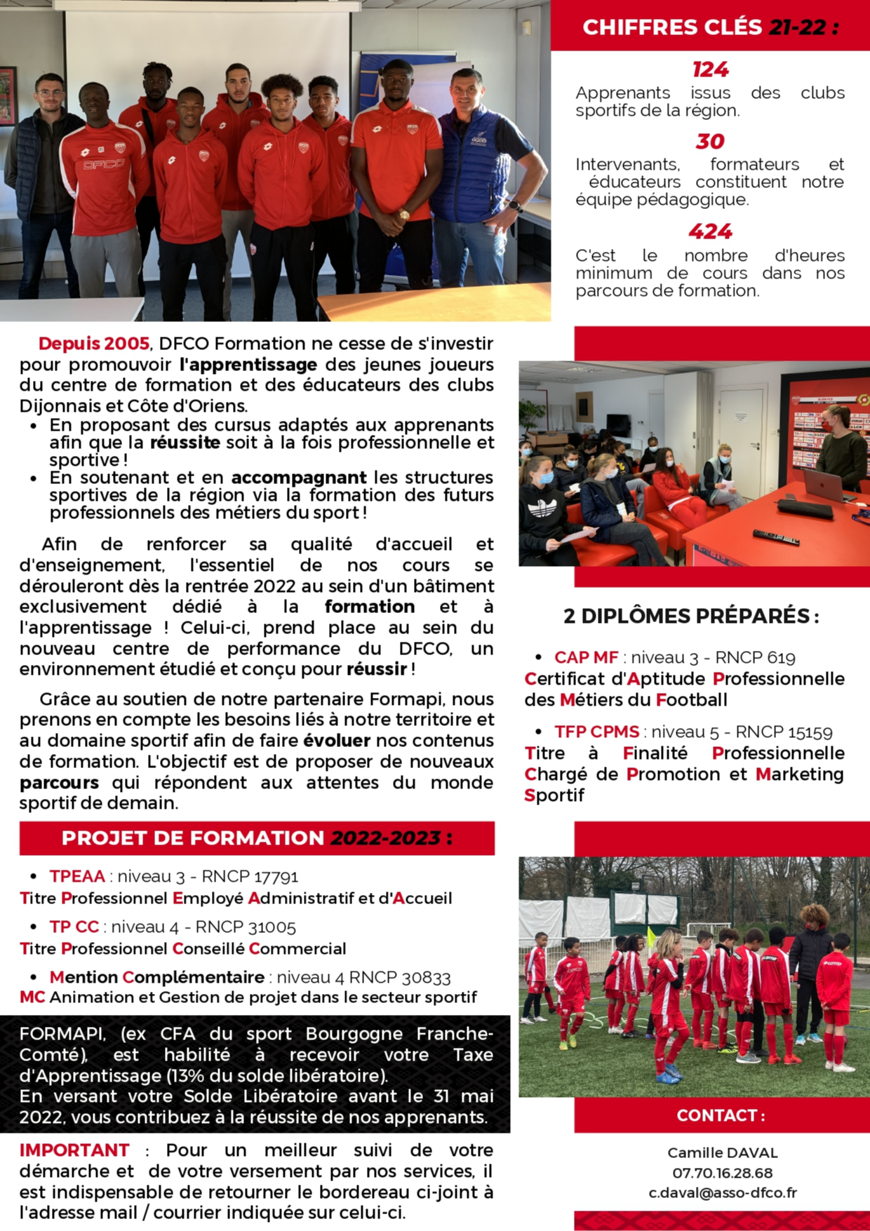 Depuis 2005, DFCO Formation forme des sportifs du club, de la région mais également partout en France via ses clubs partenaires. En 2022, 124 apprenants suivent une de nos formations diplômantes axée sur les métiers du sport.
