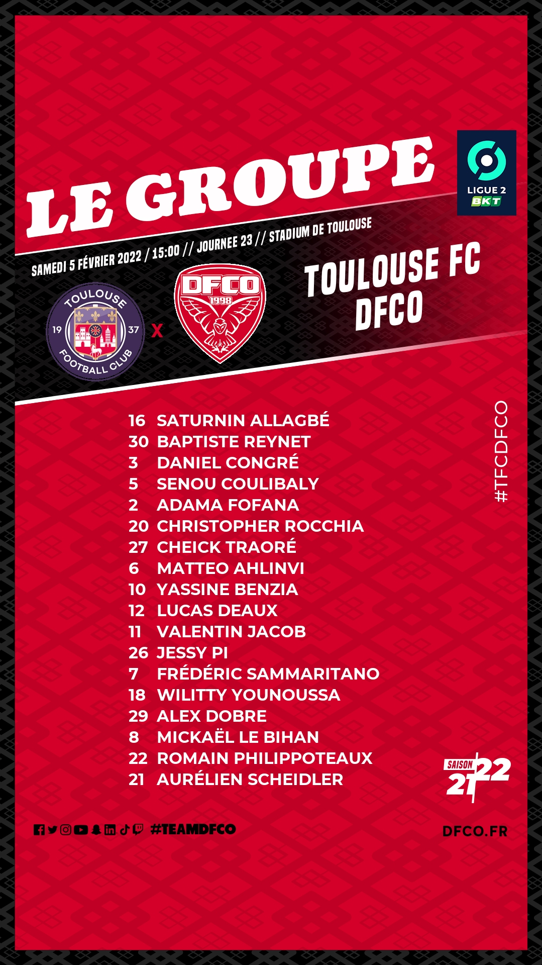 Pour le compte de la 23e journée de Ligue 2 BKT, le DFCO se déplace ce samedi au Stadium de Toulouse (15h00). Pour affronter le Toulouse FC, Patrice Garande et son staff ont convoqué 18 joueurs.