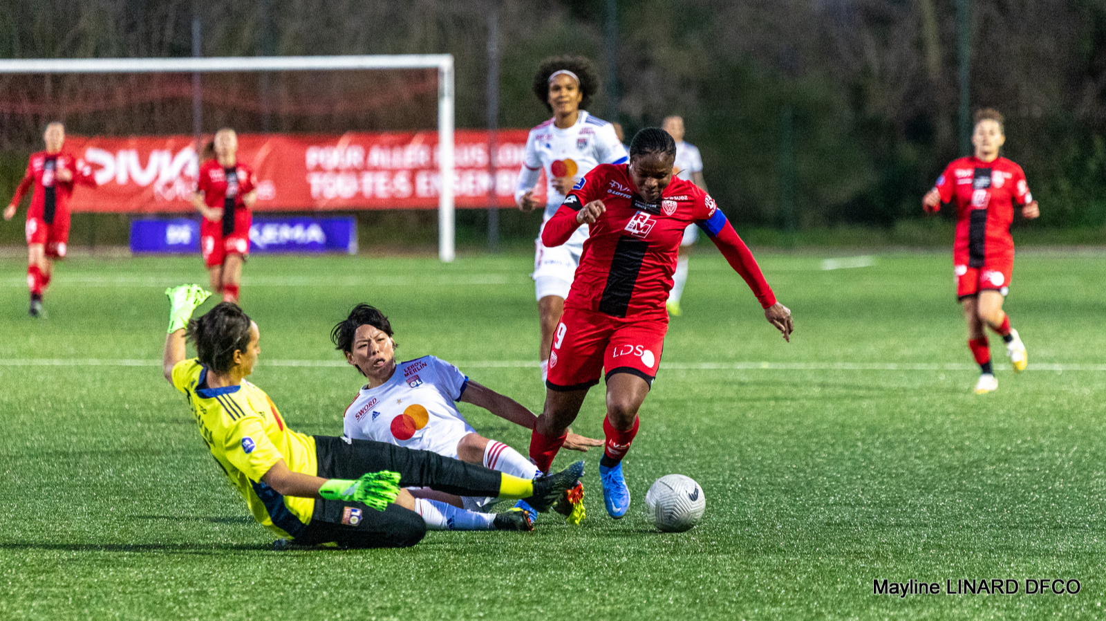 Après leur belle victoire contre Fleury (3-1), les Dijonnaises avaient à cœur de créer l’exploit face à une équipe lyonnaise actuellement deuxième du championnat. La première période a plutôt bien débuté pour le DFCO qui, pendant le premier quart d'heure, a su tenir tête aux Lyonnaises. Mais rapidement, ces dernières vont se procurer deux grosses occasions et buter sur une Mylène Chavas impeccable. Tout d’abord, après un centre de Karchaoui pour Cascarino qui reprend de la tête, notre gardienne réussit à sortir le ballon à l’aide de ses pieds (18’). Quelques minutes plus tard, c’est une tête de Le Sommer qu'elle repoussera à bout portant (20’). Deux alertes qui ont précédé le premier but lyonnais. Sur coup de pied arrêté, Désiré Oparanozie manque sa tête défensive et oblige sa propre gardienne à repousser le ballon. Derrière, Macario reprend le ballon mais c’est sauvé par Girardot. Finalement, c'est Kumagai qui marque en renard des surfaces (0-1, 24’).