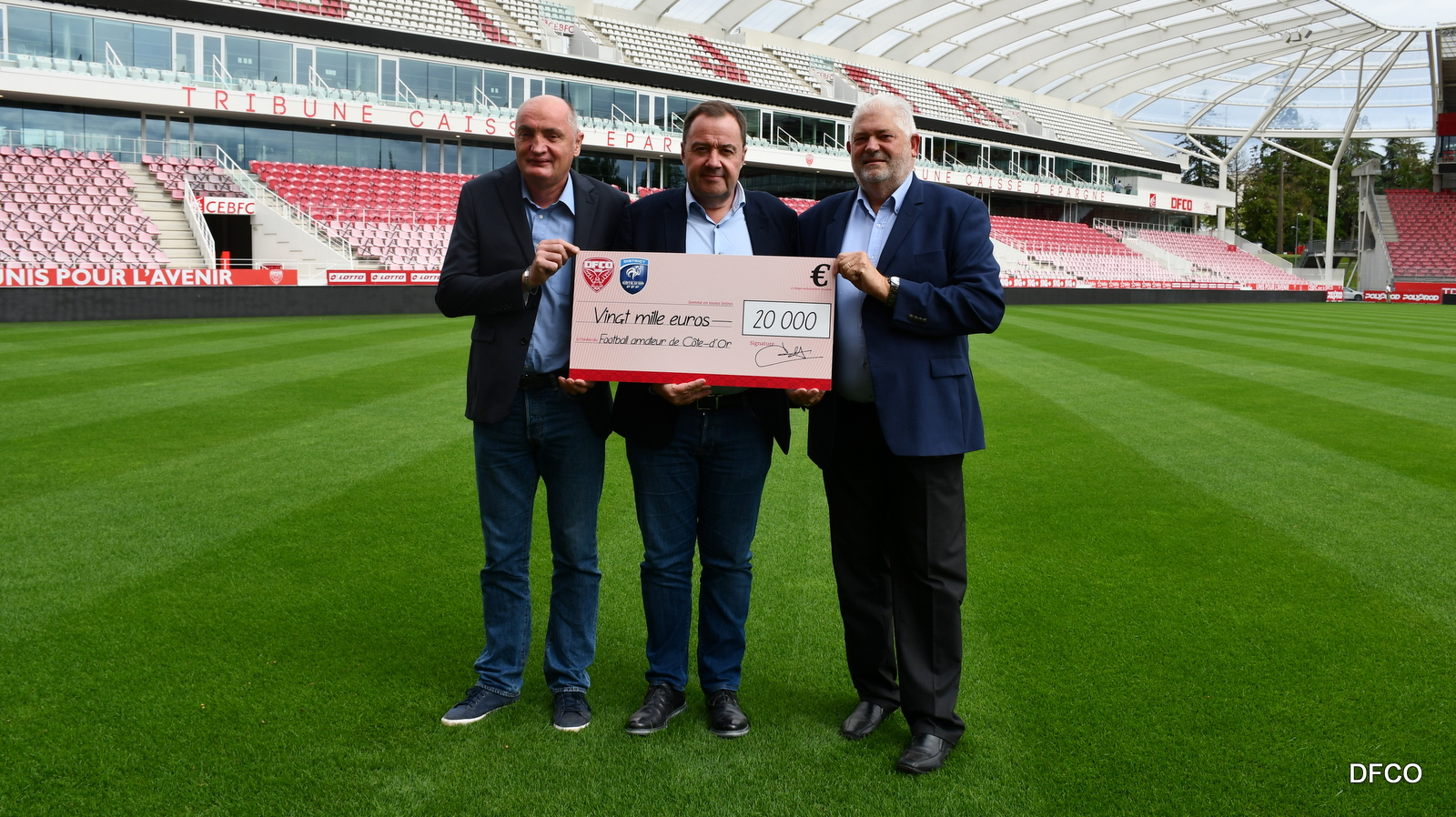 Daniel Durand, Président du District de Côte-d'Or, et Patrick Aucaigne, membre du District de Côte-d'Or, ont reçu des mains du Président Olivier Delcourt le chèque de 20 000 euros, fruit de la vente aux enchères organisée par le DFCO.