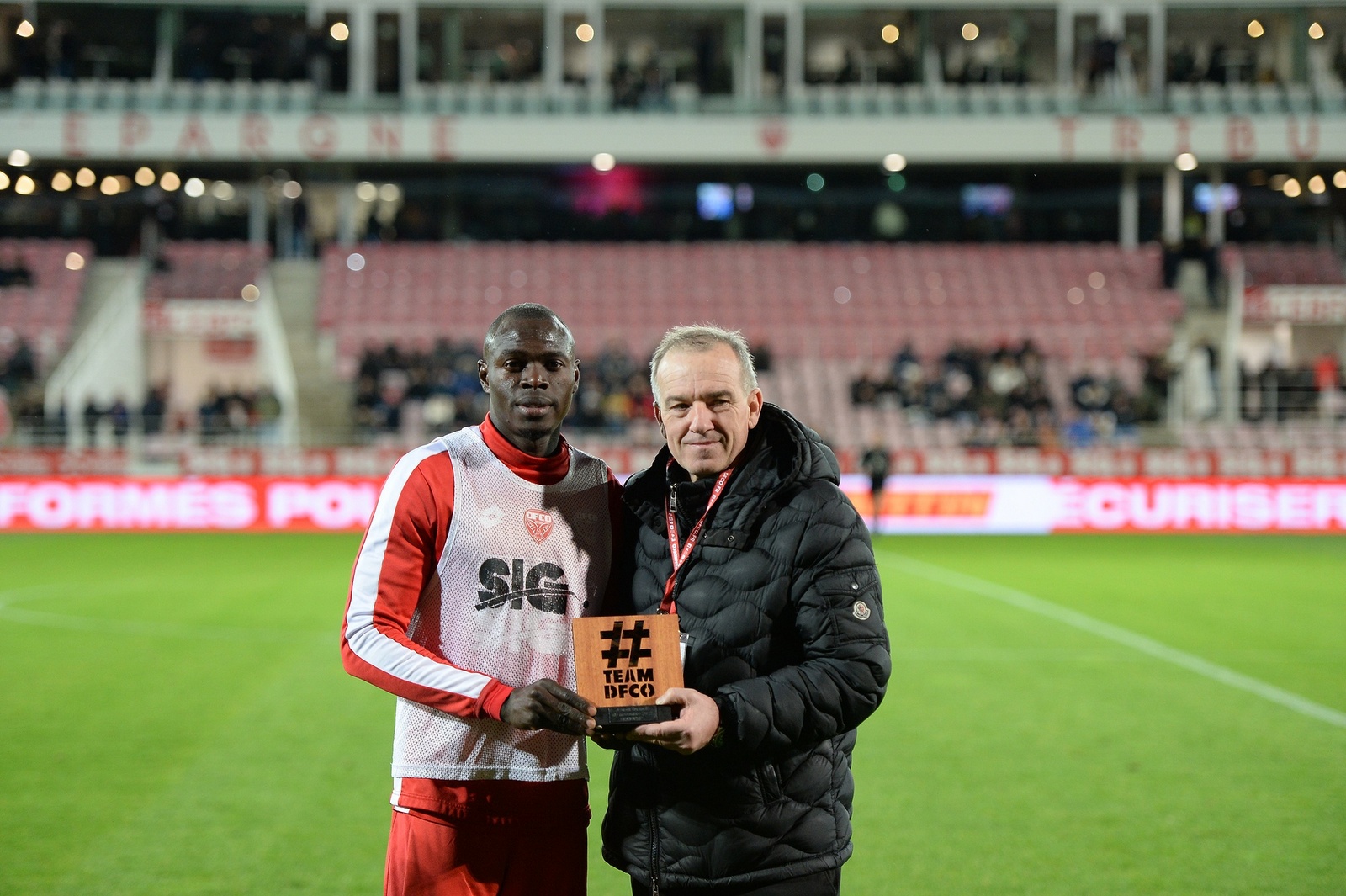 Avant le coup d’envoi de DFCO – Laval lundi soir, Claude Seguin, Directeur de la jardinerie Sonofep, partenaire du du DFCO, a remis à Zargo Touré le trophée de Joueur du mois de novembre !