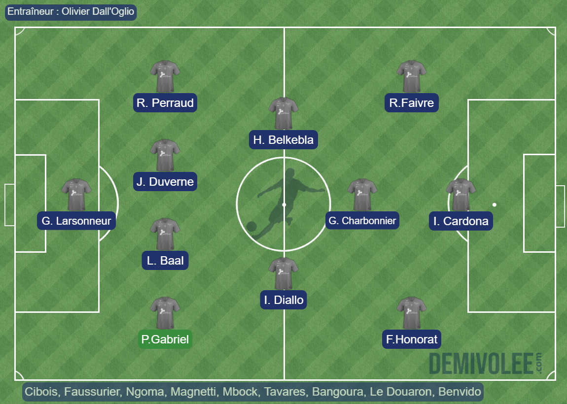 Milieux de terrain : Diallo (6), Belkebla (7), Battocchio (11), Lasne (13), N"Goma (19), Magnetti (27), Mbock (28), Saïd (25), Faivre (5), Dioh (4)